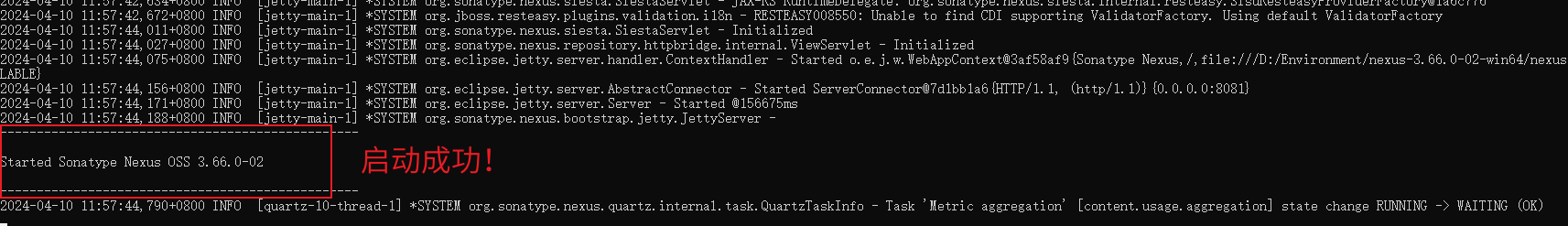 7. 当命令行最下方出现如下提示信息就说明 Nexus 初始化完成,并且成功启动: