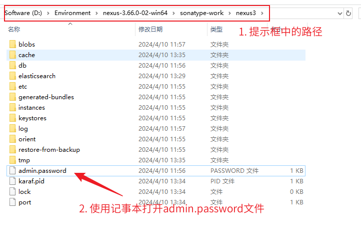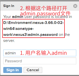 4. 首次使用 Nexus 时,系统默认会生成一个 admin 用户。用户名输入admin,然后根据输入框中的路径找到admin.password文件: