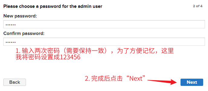 8. 这里我们需要重新设置用户admin的密码,为了方便记忆,这里我将密码设置成123456,完成后点击Next: