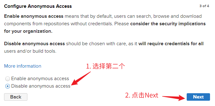 9. 配置是否允许匿名访问,处于仓库数据文件安全考虑,这里我们选择第二个禁止匿名访问Disable anonymous access。完成后点击Next:
