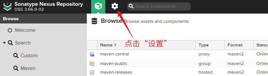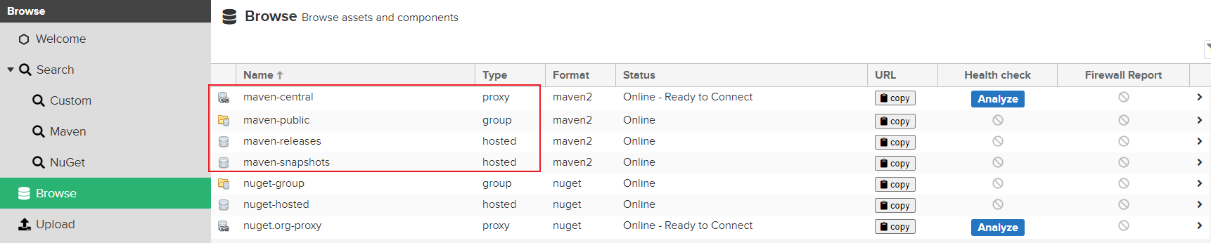 | maven-central | 代理某个远程的中央仓库/镜像仓库。如果Nexus本地不存在jar/war包,就会转到配置的远程仓库中下载。 | proxy | 代理远程仓库 |