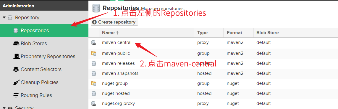 2. 点击左侧的Repositories,然后点击列表中的maven-central: