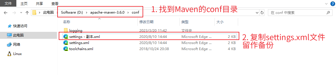 1. 找到 Maven 本地安装路径,打开conf目录,然后将这个目录下的setting.xml复制一份留作备份: