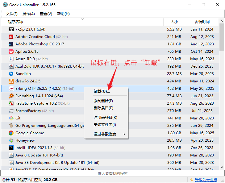 1. 打开 Geek Uninstaller,找到 Erlang,鼠标右键点击卸载: