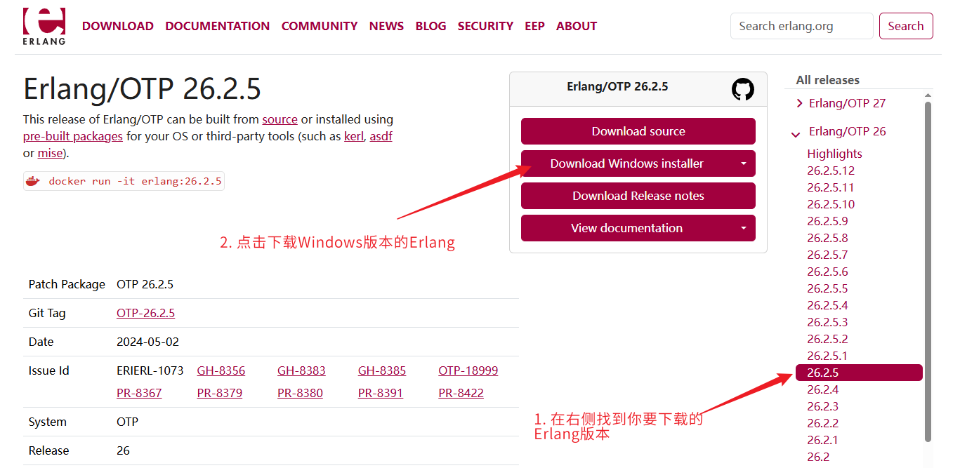 2. 在右侧找到你要下载的版本,这里我下载的是 26.2.5 版本的 Erlang,按照下图操作点击下载: