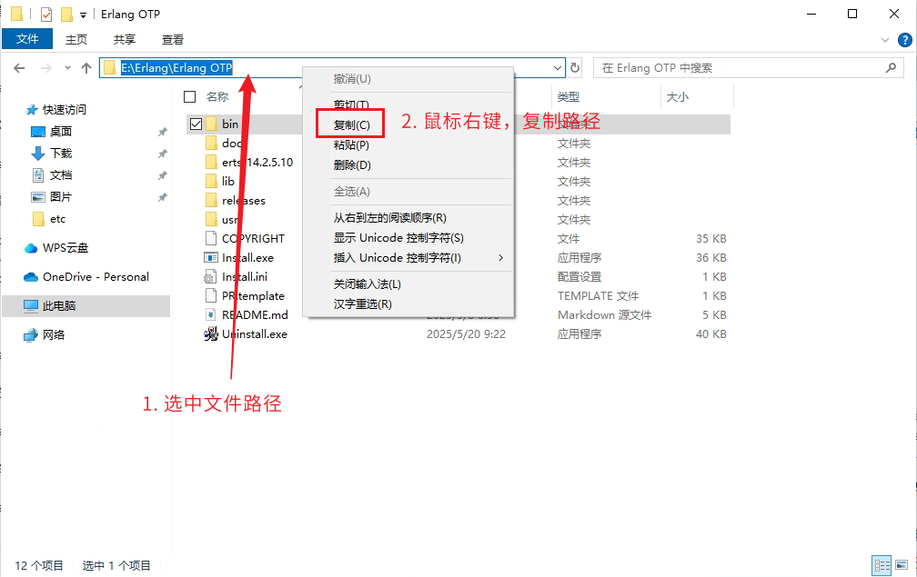 1. 找到 Erlang 的安装路径,出现 bin、doc、lib 等文件夹,点击上方路径,鼠标右键点击复制: