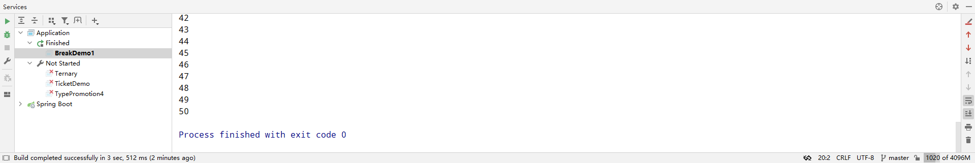 例如:正常输出1~100的过程中,如果我想让循环之输出到第50个数就终止循环,就可以使用break关键字: