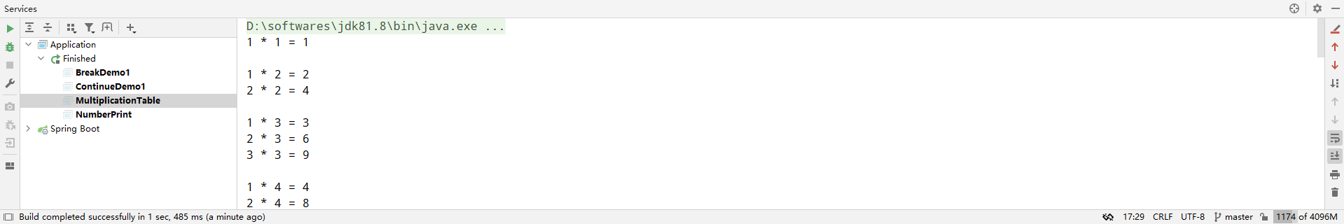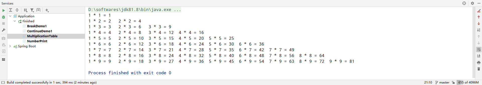 虽然得到的结果是正确的,但是样式并不符合九九乘法表的样子,我们只需要使用制表符\t和不换行输出的System.out.print();做一下处理即可: