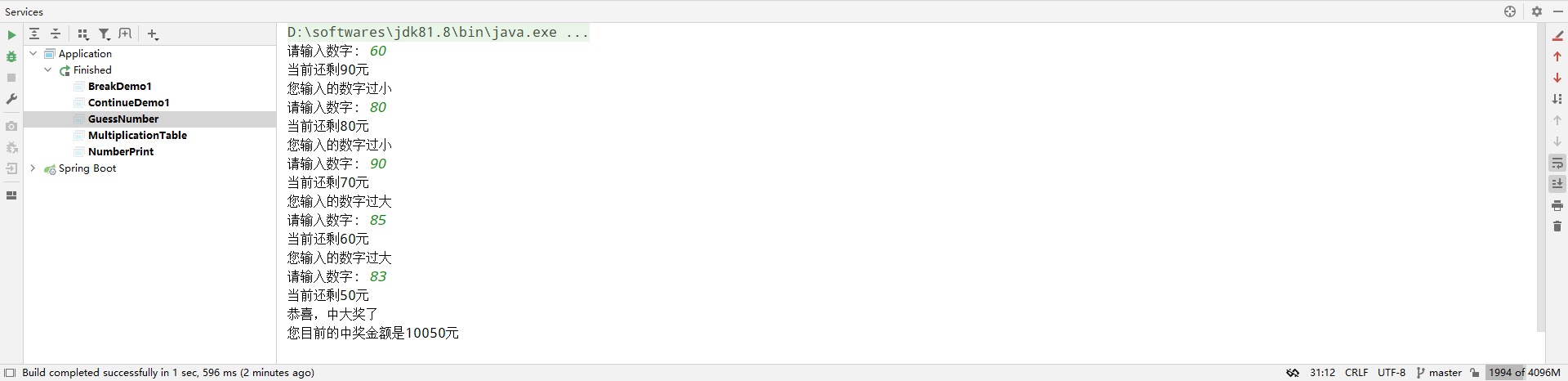 2. 搞定了随机数的生成以后,我们需要保证用户能多次输入,需要定义一个循环,在循环外边定义一个Scanner,具体的输入操作放入到循环中,这样就能保证用户多次输入了。