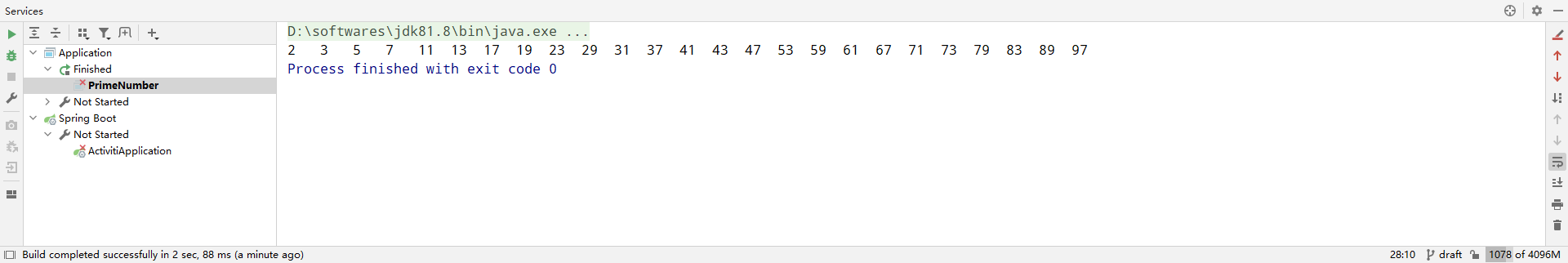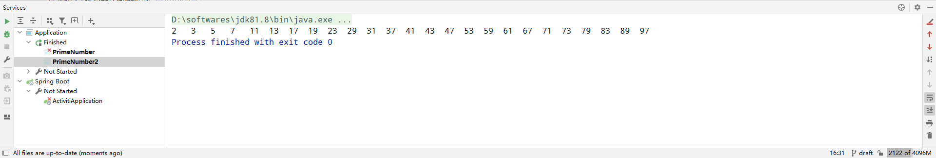 同理,如果一个数如果是素数,即使到这个数的平方根之前也不可能存在能整除这个素数的数。因此,内层循环我们可以将j的范围改为(int) Math.sqrt(i)(数字的平方根求整)即可: