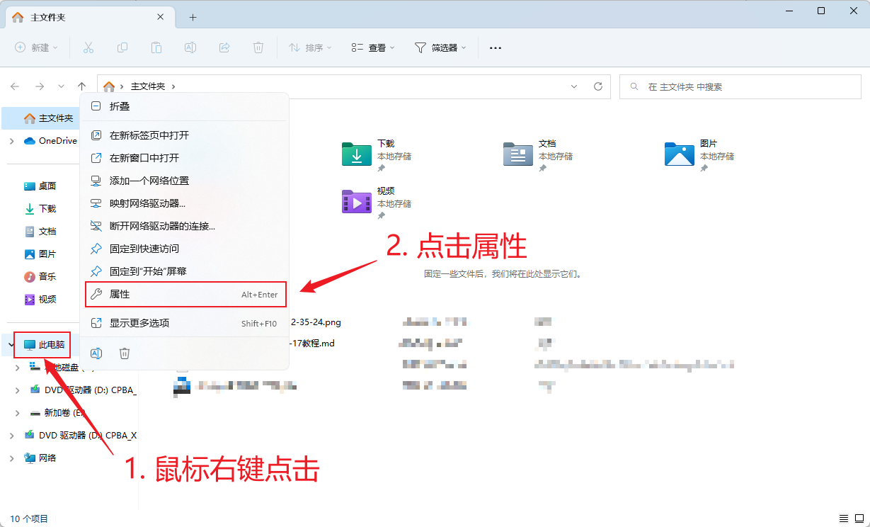 3. 打开文件夹,在左侧鼠标右键点击此电脑,点击属性: