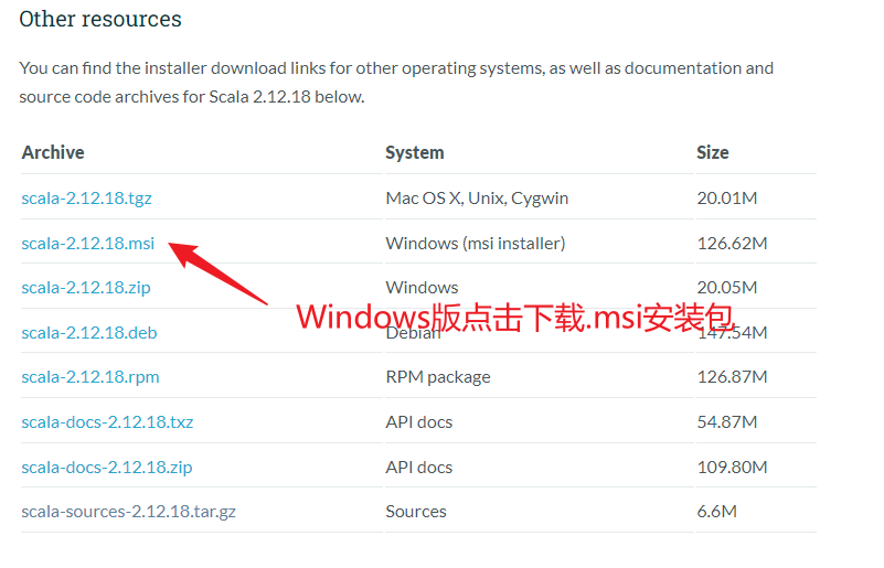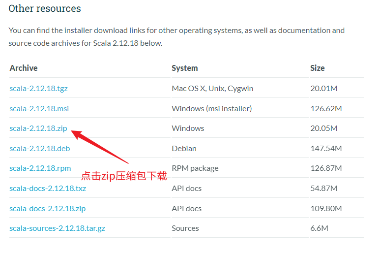 3. 进入下载页面后,向下找到各个版本的下载链接,我使用的是Windows操作系统,选择 Windows 环境的 Scala 进行下载: