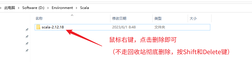 1. 找到Scala的安装目录,鼠标右键删除即可(如果不走回收站彻底删除,就直接按Shift和Delete键)