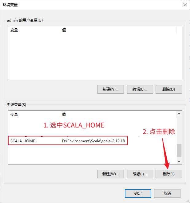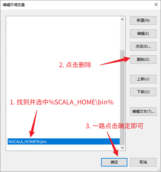 2. 删除环境变量:按照前面配置步骤,打开环境变量。找到前面我们配置的SCALA_HOME,点击右下角删除: