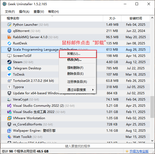 1. 打开 Geek Uninstaller,找到 Scala,鼠标右键点击卸载: