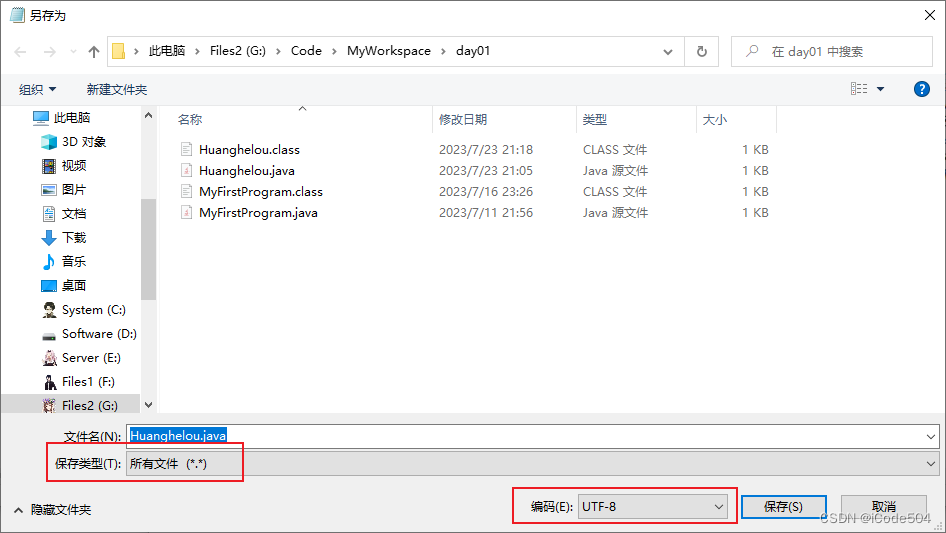编写完Java代码以后,点击在左上角文件,然后点击另存为,下方选择所有文件,编码格式选择UTF-8: