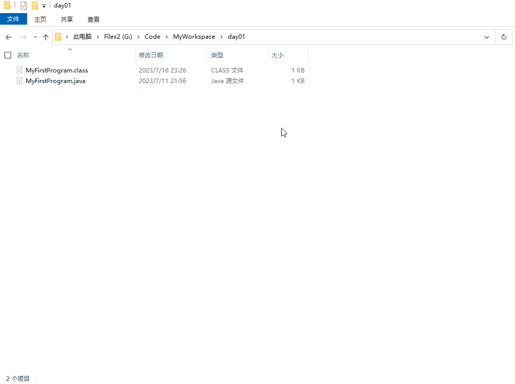 操作步骤如下图所示,上述命令执行完成后,此时文件夹中有一个MyFirstProgram.class文件,这个是Java编译器执行编译命令以后生成的二进制字节码文件(直接使用记事本打开是乱码文件):