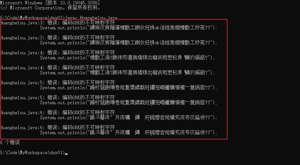 执行编译命令:javac Huanghelou.java,执行此命令以后,命令行会提示以下错误信息:
