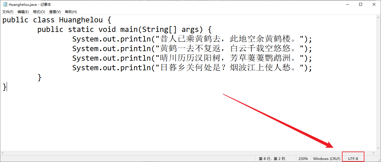 这里解释一下出现编码GBK的不可映射字符的问题:由于我们之前编写的Java源文件在保存时的编码格式是UTF-8(如下图所示)