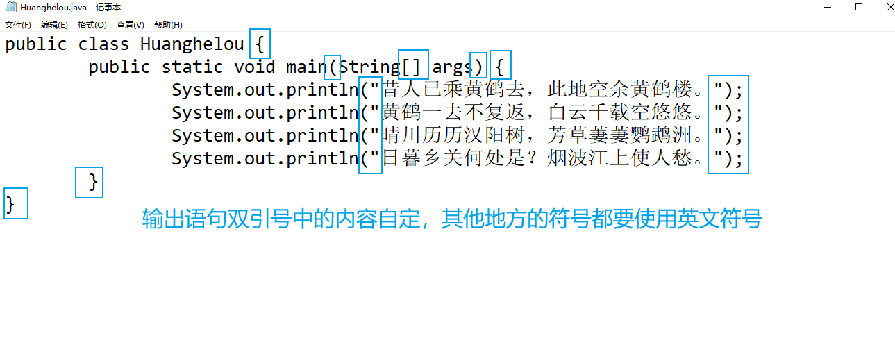 2. 除了System.out.println("");语句的双引号中的内容自定,代码中其他地方都要使用英文符号。