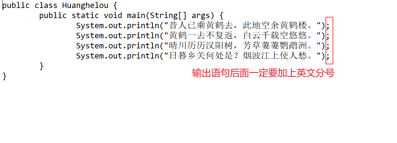 因为我们要输出4行诗句。因此要在Java的main()方法中编写4行输出语句,效果如下图:
