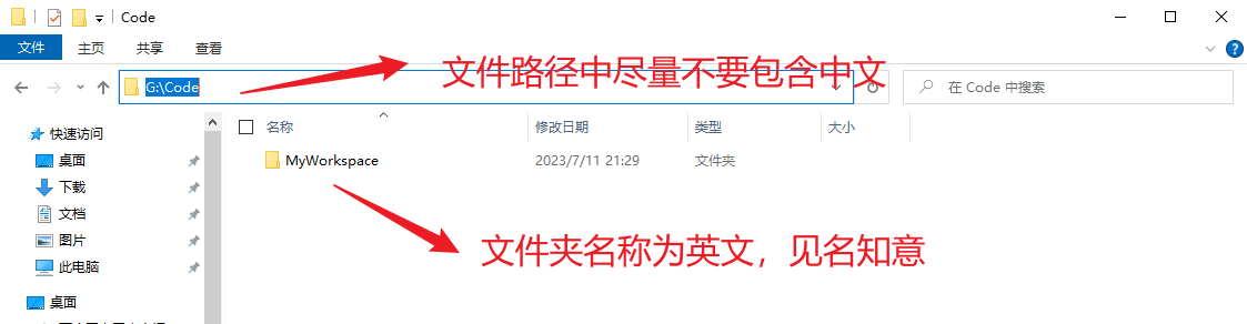 创建一个文件夹,保证自己以后学习过程中的代码都存放到这个文件夹中,养成好习惯。为了避免后续出现问题,文件路径中尽量不要包含中文字符。这里我新建的文件夹名是MyWorkspace,如下图: