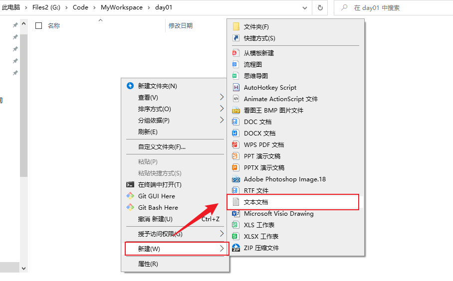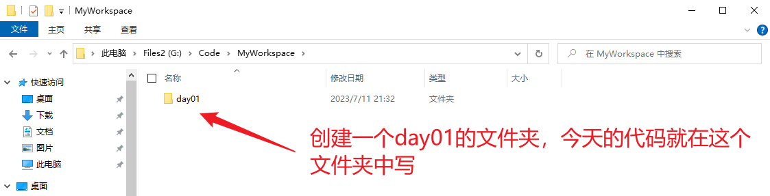 打开MyWorkspace文件夹,今天是我们第一次敲代码,就在这个文件夹中创建一个day01文件夹,如下图所示: