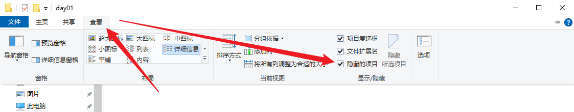 打开day01文件夹,点击上方的查看,勾选文件扩展名: