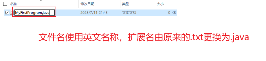 此时新建完成以后,我们选中这个文件,鼠标右键点击重命名,将文件名修改成MyFirstProgram.java。我们此时需要留意下这个文件名MyFirstProgram,后续它有大用处!