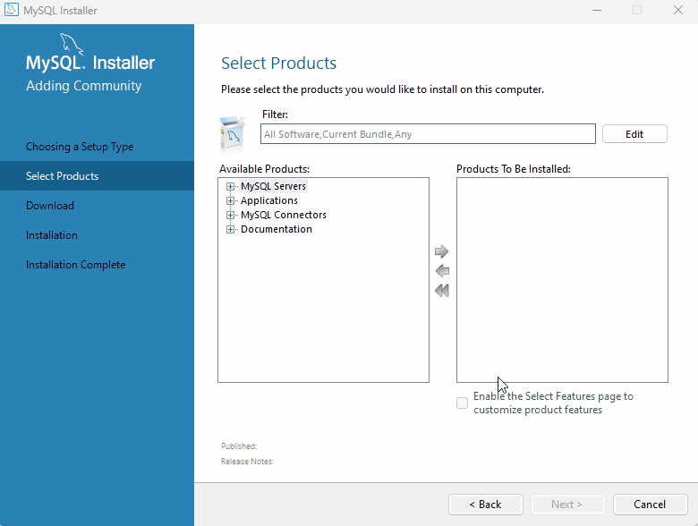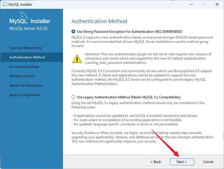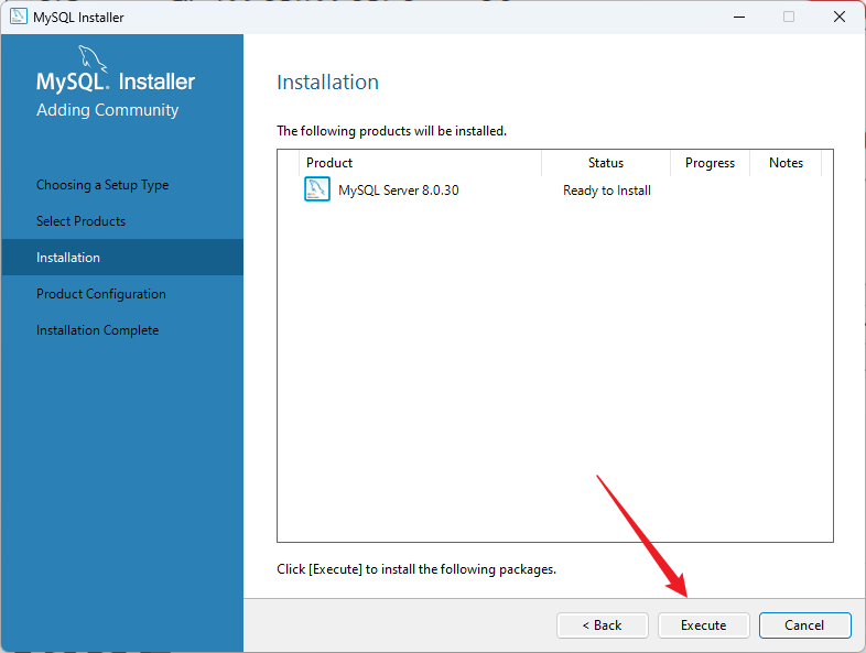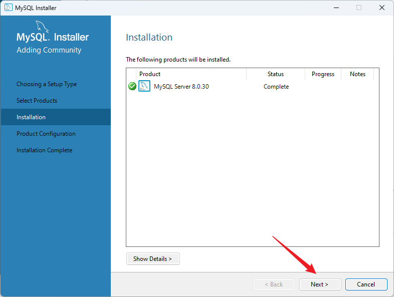 4. 按照下图所示操作,选择安装MySQL Server 8.0.30 - X64,完成后直接点击Next: