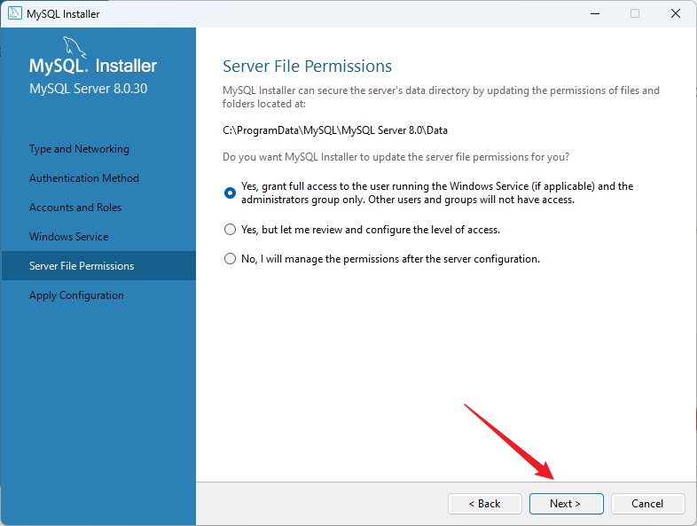 13. 服务器文件权限按照默认配置选择第一个即可,点击Next: