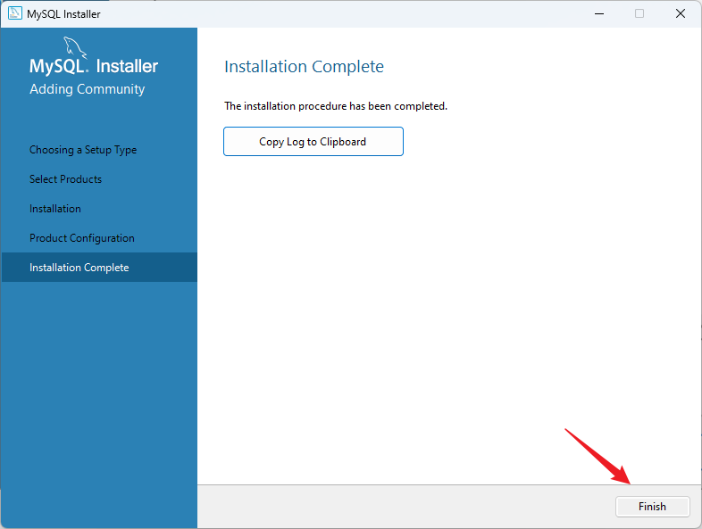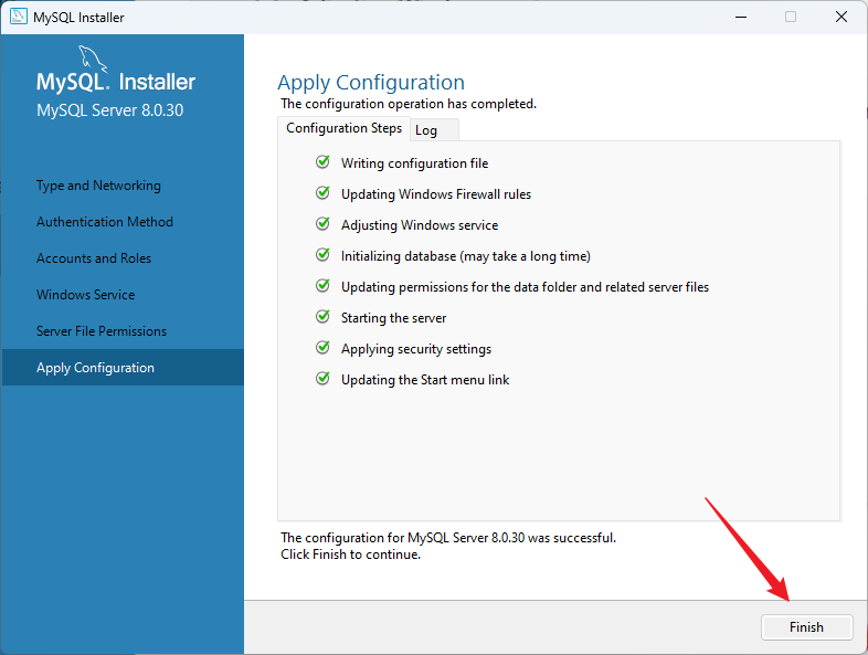 15. 出现下图信息,说明MySQL配置成功,点击Finish: