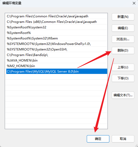 - 选中MySQL环境变量,点击删除,然后一路点击确定即可。
