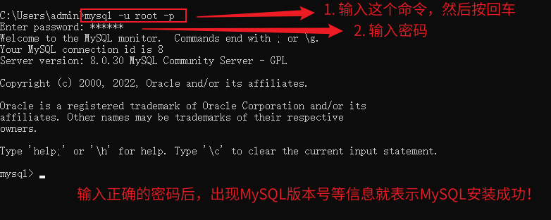 7. 按Win和R键,输入cmd,点击进入,在命令提示行中输入mysql -u root -p,按回车后会提示让你输入密码。这个密码是前面我们安装MySQL的时候设置的密码,输入完成后按回车即可。完成后出现下图界面表示MySQL安装成功!