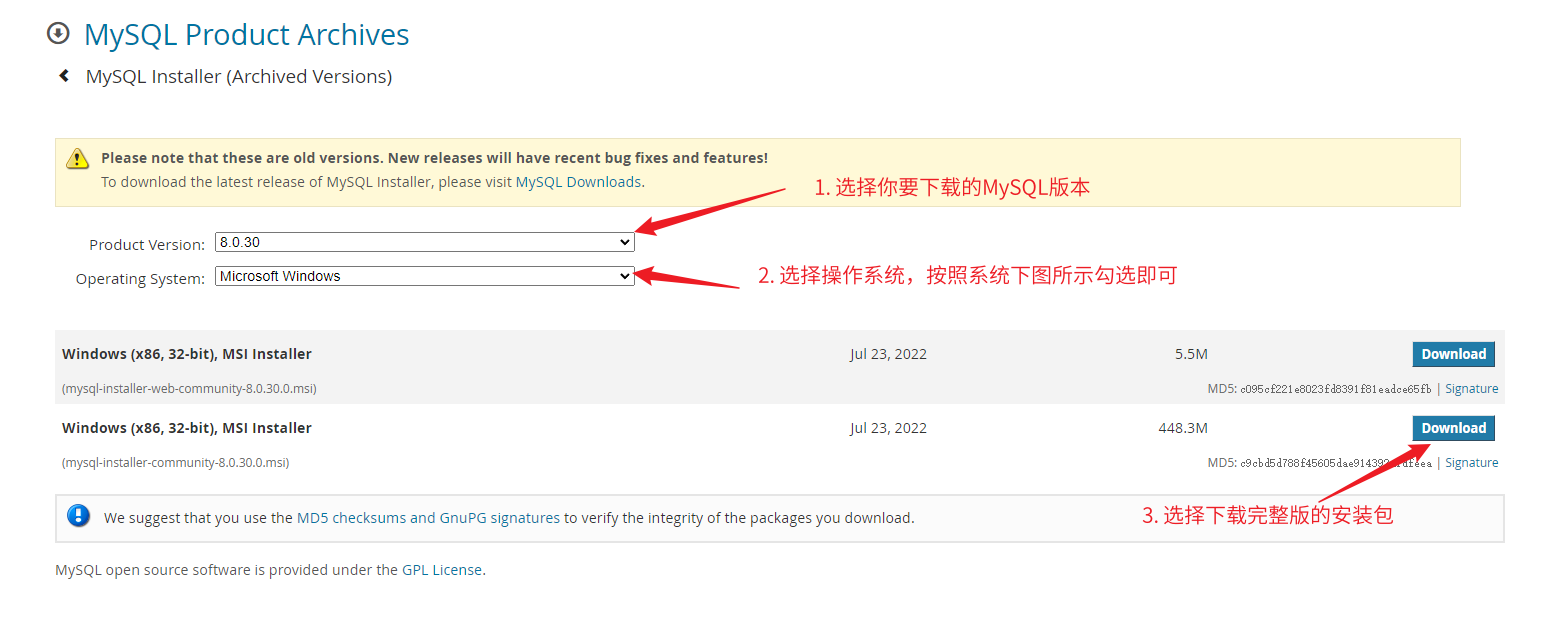 2. 按照下图所示操作选择相应的MySQL版本下载,这里我选择的Windows MySQL 8.0.30版本。