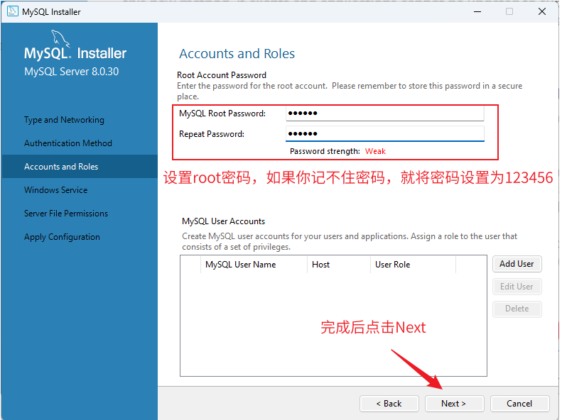 11. 设置root账户密码,这里强烈建议将密码设置成你最熟悉的密码,否则后续恢复密码比较麻烦。这里我设置成了123456。设置完成后点击Next: