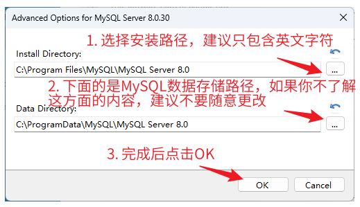 - 按照下图所示,选择安装路径,为避免后续过程中出现问题,安装路径建议只包含英文字符;下面的是MySQL数据存储路径,如果不懂这方面的内容,建议不要修改这个路径。配置完成后后点击OK: