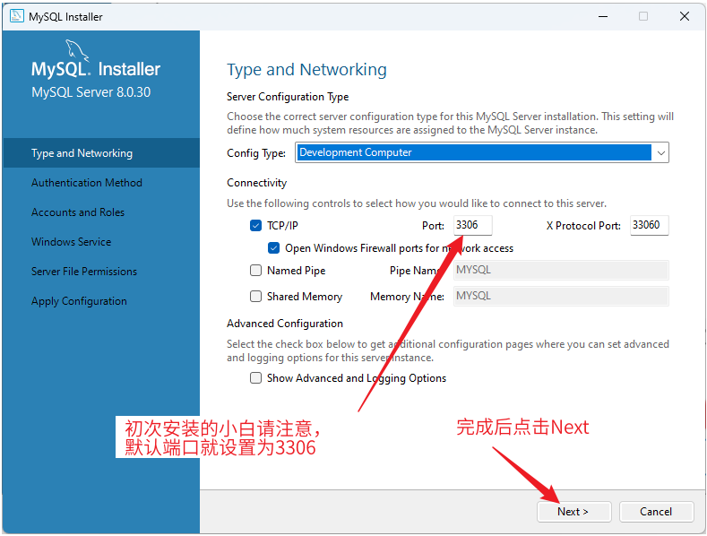9. 初次安装MySQL的小白请注意,下图的Port请务必配置成3306,完成后点击Next:
