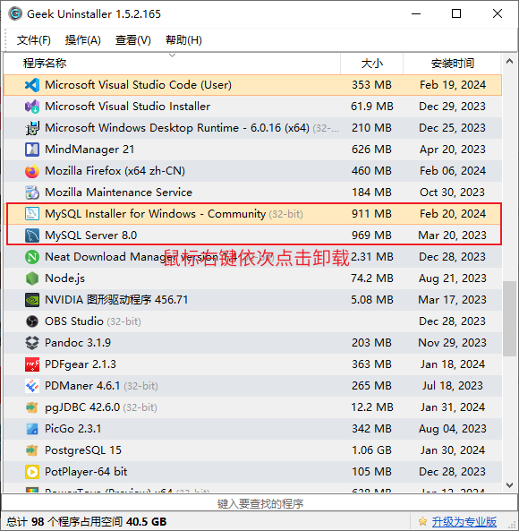 1. 打开Geek Installer,在程序列表中找到MySQL相关的内容,鼠标右键,依次点击卸载: