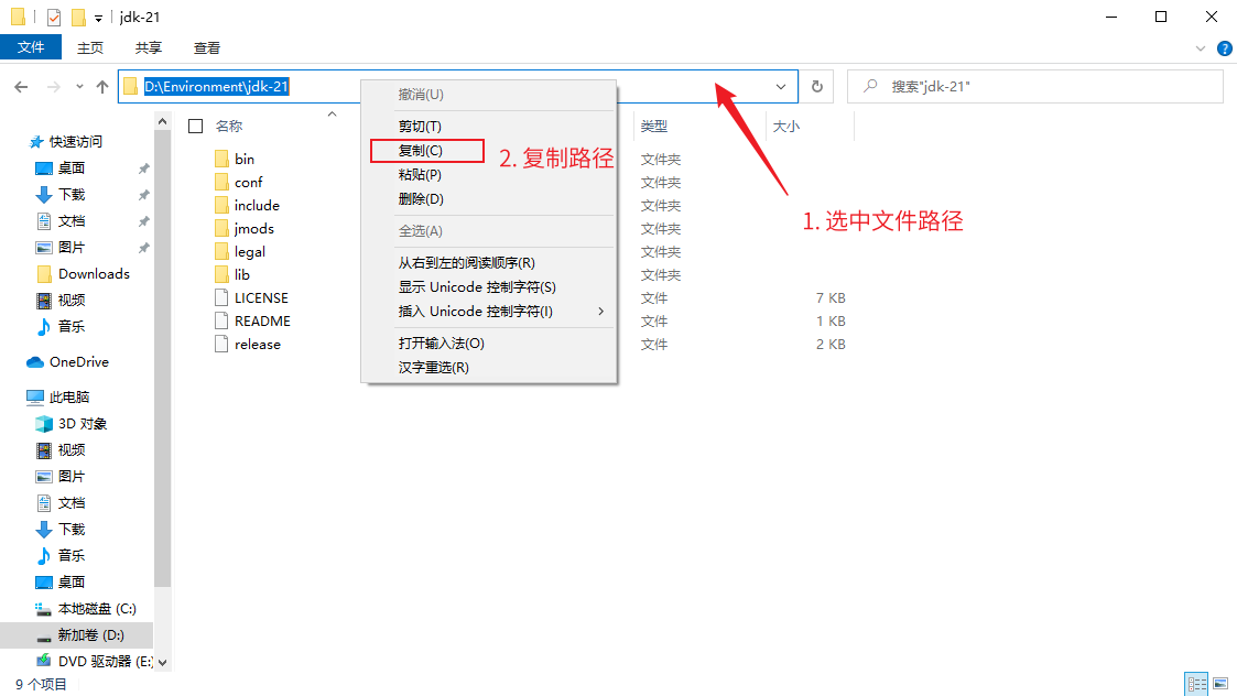 1. 找到JDK的安装路径,出现bin、conf等文件夹,点击上方路径,鼠标右键点击复制: