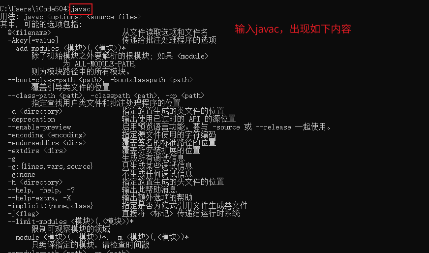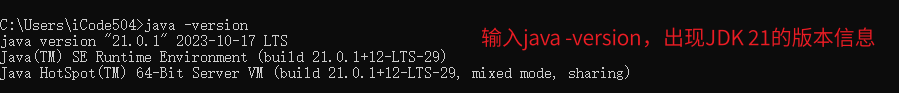 10. 在命令行中,分别输入javac、java、java -version,如果有如下提示就说明JDK 21安装成功了: