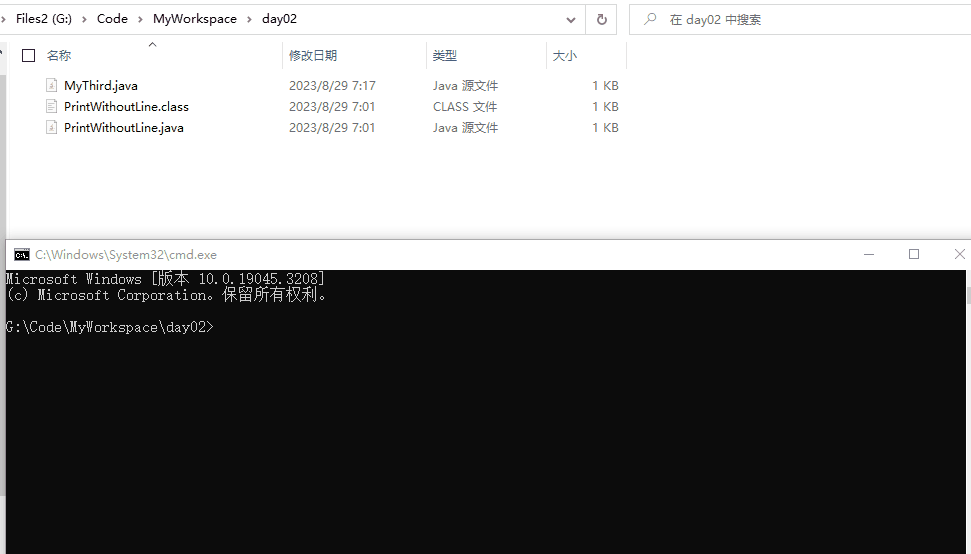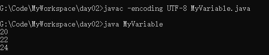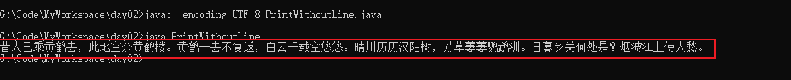 以下是使用javac encoding PrintWithoutLine.java和java PrintWithoutLine命令的执行结果: