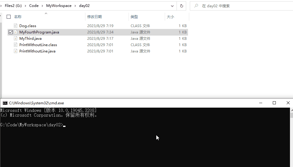 执行了javac命令时,我们发现它并没有生成MyThirdProgram.class文件,而是生成了Dog.class文件。这是因为前面我们的MyThirdProgram.java文件中只有一个Dog类,并不包含由public修饰的MyThirdProgram类。