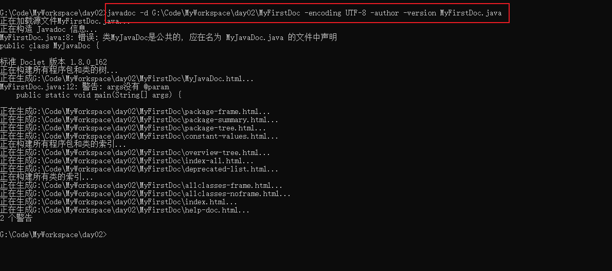 我们可以使用javadoc命令对代码中的文档注释进行解析,生成一套网页形式的文档。命令格式为:
