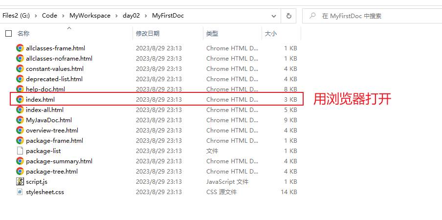 此时我们进入G:\Code\MyWorkspace\day02\MyFirstDoc路径中,我们可以看到如下内容,直接使用浏览器打开index.html: