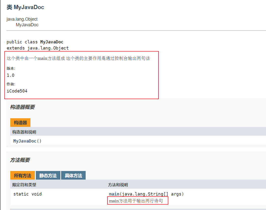 这个类的类名叫做MyJavaDoc,方法名称作main。