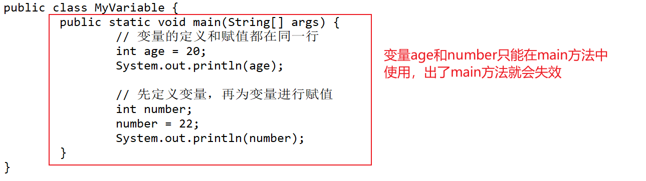 3. 变量的作用域:作用域在最近的外层大括号内,变量只有定义在作用域内才有效。以上述MyVariable类为例,变量age和number的作用域只能在main方法中,因为两个变量最近的外层大括号就是在main方法的范围,出了main方法会导致Java将无法识别这个变量而出现编译错误。