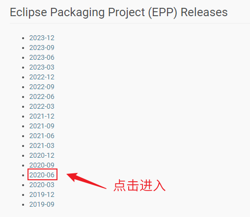 2. 点我进入Eclipse官网下载列表。由于我电脑上安装的是JDK 8,我需要选择2020-06及之前的版本,这里我选择2020-06版本的Eclipse下载: