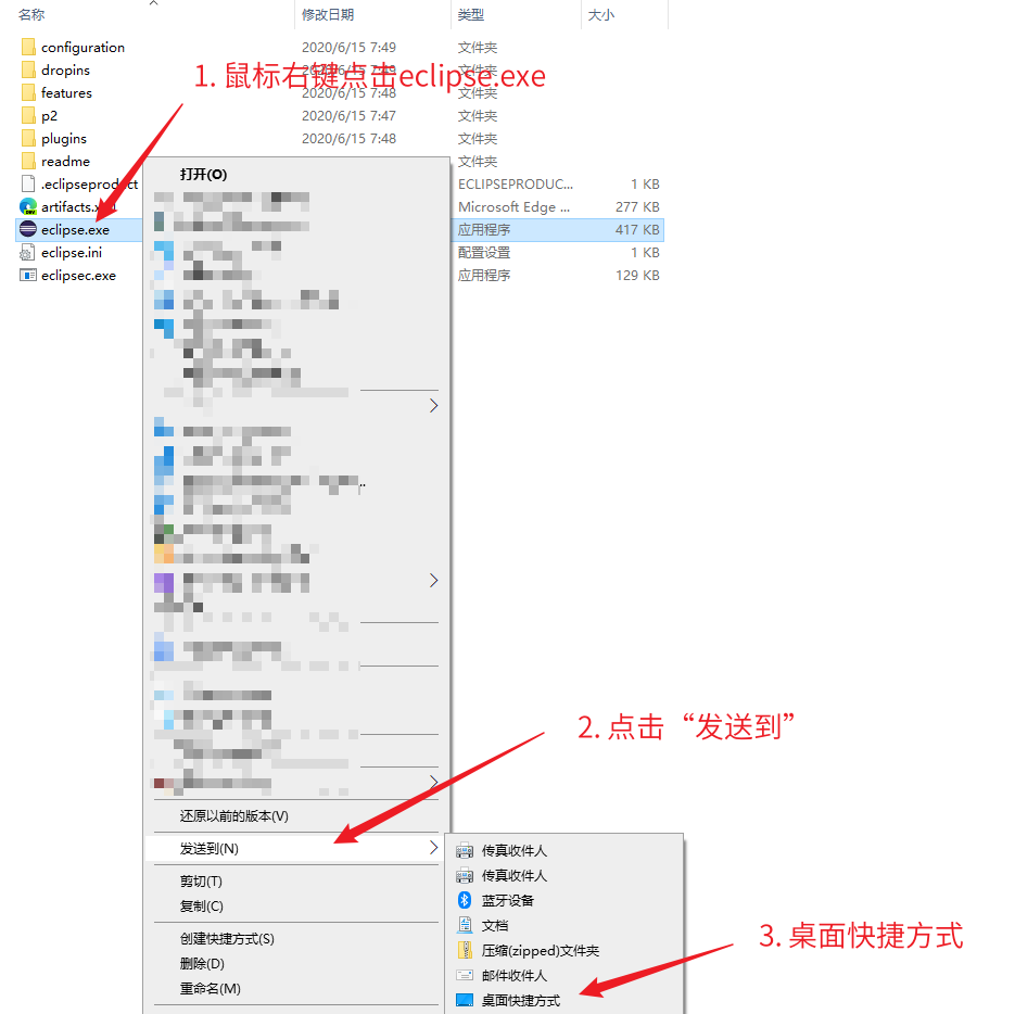 5. 按照下图所示操作将Eclipse设置成桌面快捷方式,以后只需要在桌面直接打开快捷方式就可以了,比较方便。