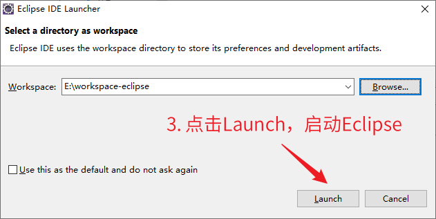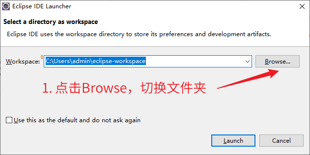 1. 在桌面双击打开Eclipse,此时会弹出一个选择工作空间Workspace的界面。点击Browse,选择一个你熟悉的文件夹,然后点击Launch即可:
